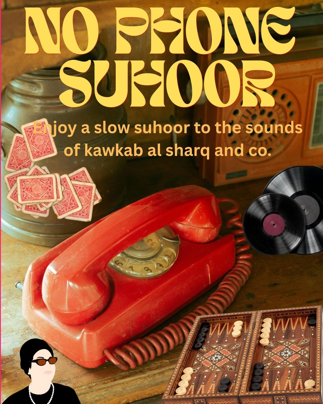 Come enjoy a time of human connection and digital disconnection. Each suhoor will have a selection of reflection driven activations, food, dessert, workshops, and meetups. Enjoy it to the background music of the golden age of Um Kalthoum and the music of her time. We encourage you to keep your phone with us for the duration of the suhoor so you scroll less and be more present.
